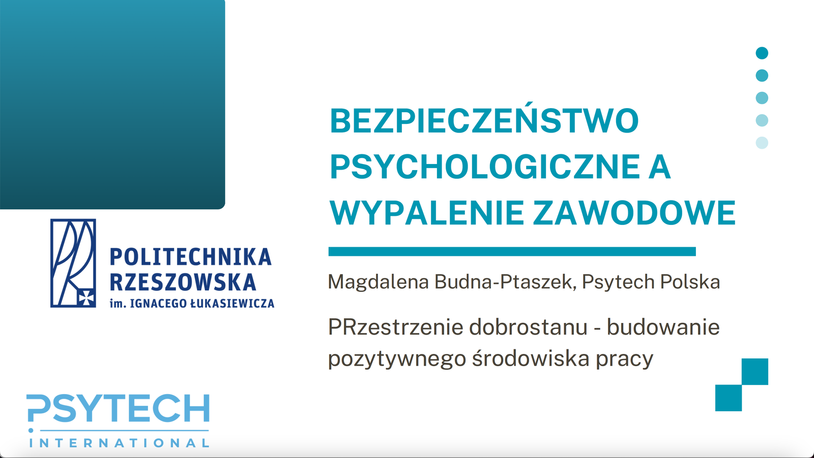 W dniu 19 lutego br. na Politechnice Rzeszowskiej odbyło się webinarium "Bezpieczeństwo psychologiczne a wypalenie zawodowe" poprowadzone przez Panią Magdalenę Budną-Ptaszek, psychologa pracy i stresu.
