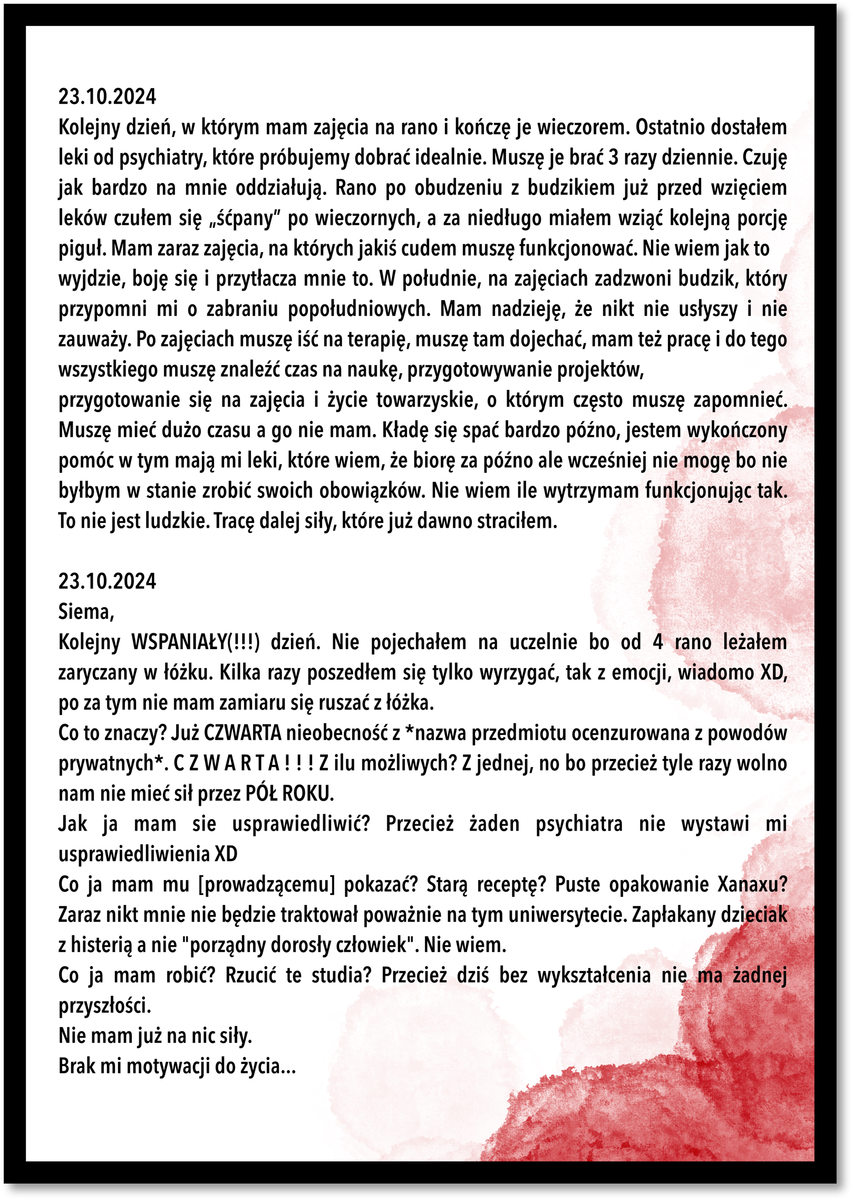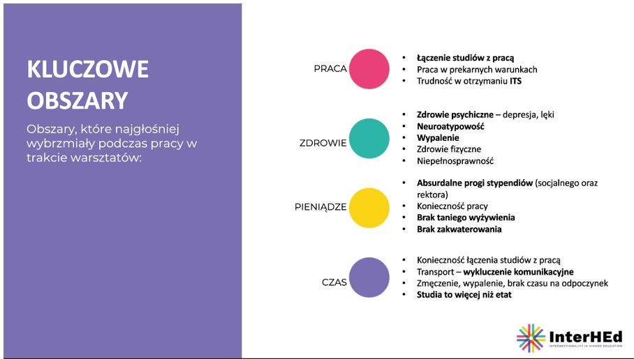 Uczestnicy projektu badali codzienne życie i trudności osób studiujących. Kluczowe obszary, które najgłośniej wybrzmiały podczas pracy warsztatowej przedstawiłam na zdjęciu poniżej. W kontekście tych danych, pokazany przez prelegentki wycinek pamiętnika studenta zmusza do refleksji nad obecną kondycją psychiczną młodzieży studiującej...