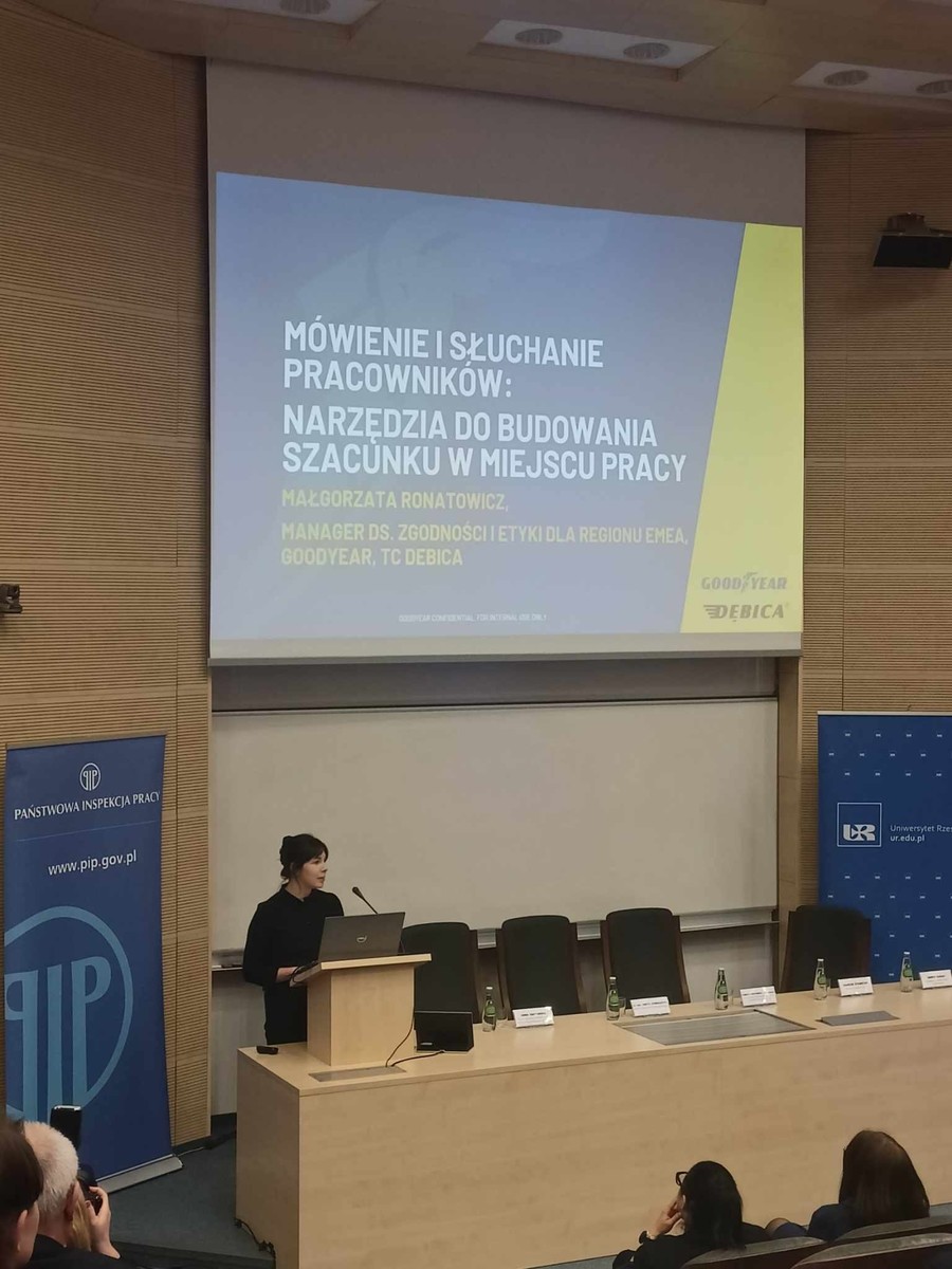 Jednym z ciekawszych punktów programu było zaprezentowanie dobrych praktyk w tym temacie. Swoje podejście do tematu zagrożeń psychospołecznych w zakładzie pracy, a właściwie do tematu dbania o dobrostan swoich pracowników przedstawiły przedstawicielki firmy Tarkett Sp. z o.o. z Jasła oraz Firmy Oponiarskiej Dębica S.A..